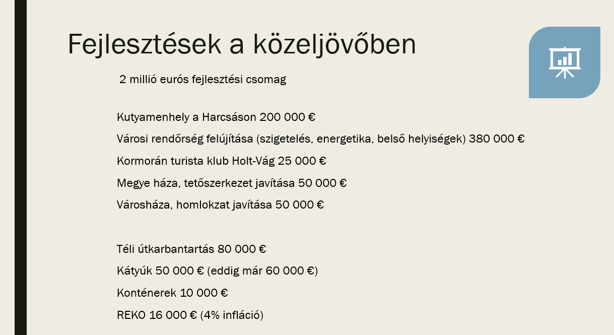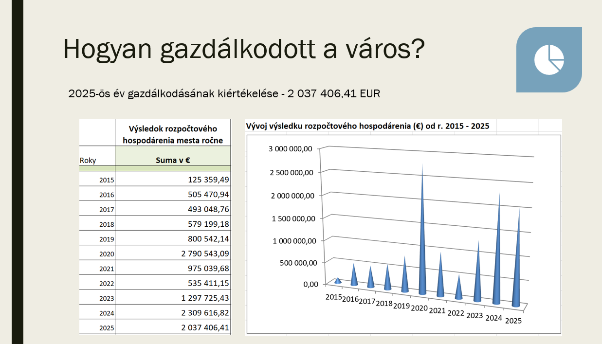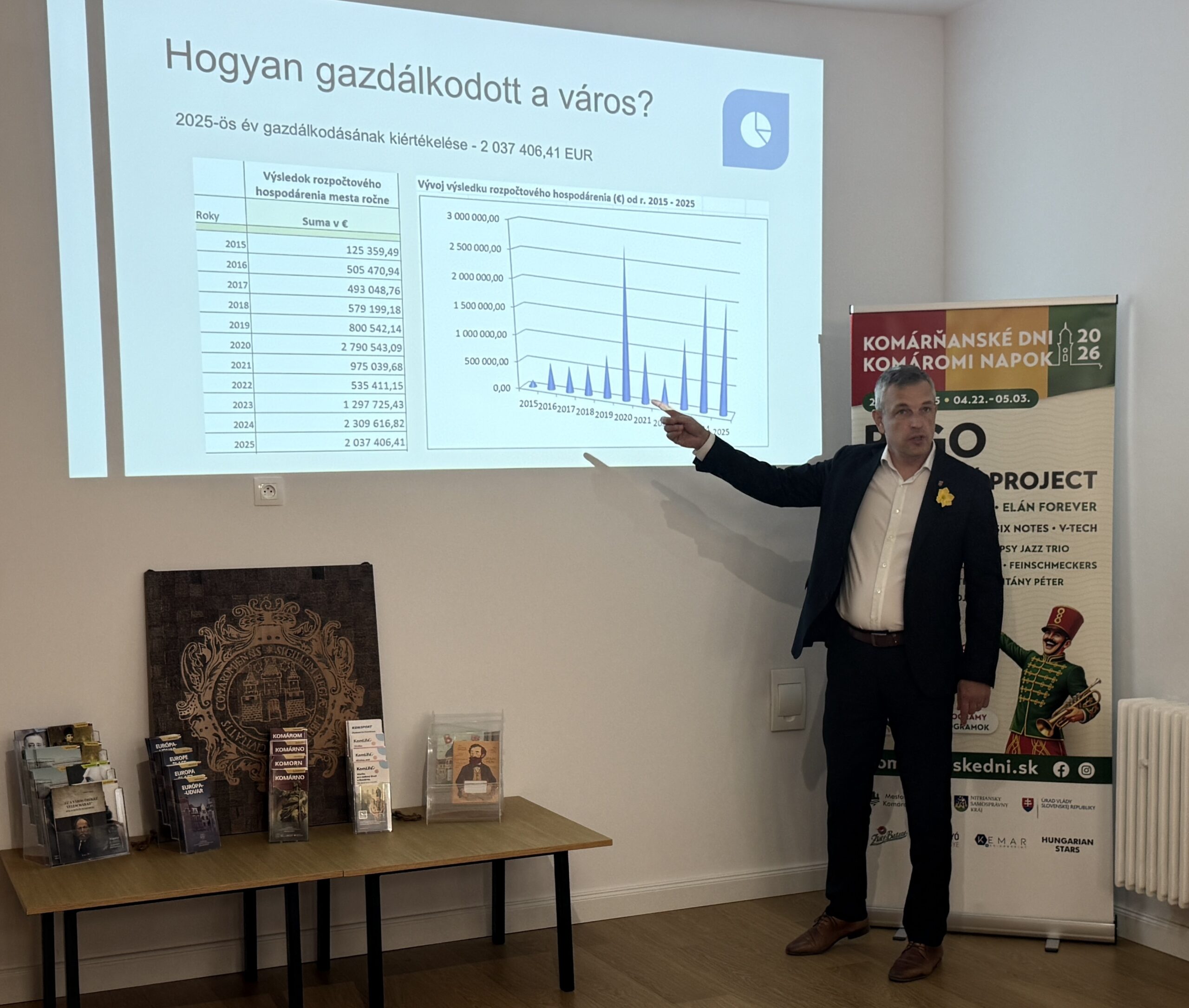 A polgármester szerint a város tavalyi éve nemcsak adminisztratív értelemben zárult sikeresen, hanem pénzügyi mozgásteret is teremtett. A 2025-ös gazdálkodási eredmény, valamint a tartalékalapban maradt összeg együtt teszi lehetővé, hogy a város most ne pusztán működtessen, hanem fejlesszen is. Keszegh Béla külön kitért arra is, hogy a hitelterhelés mértéke az országos átlag alatt marad: miközben a szlovákiai városok átlaga 19,26 százalék, Komárom 12,76 százalékon állt az év végén. A városvezetés ezzel egyértelműen azt üzeni: a most tervezett beruházások mögött nem felelőtlen eladósodás, hanem tudatos pénzügyi fegyelem áll.