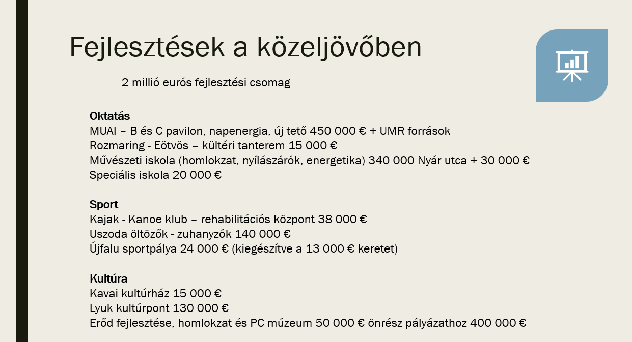 Ugyancsak fontos tétel a művészeti iskola felújítása, amelyet a város saját erőből szeretne megoldani, miután a pályázati lehetőségek korábban rendre elakadtak. Az egyik oldalon energetikai korszerűsítés, a másikon homlokzatfelújítás jöhet. Segítséget kaphat a Kassai utcai speciális iskola is, ahol csatornázási, szigetelési és további javítási munkákra lenne szükség. A sport területén folytatódhat a kajak-kenu központ fejlesztése, az uszodában az öltözők és zuhanyzók újulhatnak meg, míg Őrsújfalun a sportpálya további támogatást kapna. A kultúra sem marad háttérben: a kavai kultúrház utolsó nagyobb belső rendezése is megvalósulhat.